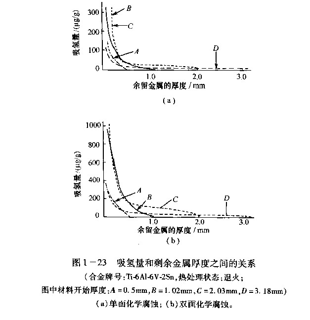 从图1 23中可以看出,在对钛合金板材进行双而腐蚀时,所吸收的氢同只化学腐蚀一个面时相比,将更多。当腐蚀深度增加时,化学腐蚀后,在剩余金属中氧的含量从图1—23中分析结果表明,在单面化学腐蚀厚度大约为0 25咖一0 5l…,在双面化学腐蚀厚度大约为0 51一一l 02rn邢时,在以上两种情况下吸氢量会急剧增加。这些结果表踢:氨是被吸收在从腐蚀的表面到厚度为0 25rn-¨~0 51mm的一层金属范围内,当向金属内进行化学腐蚀时,吸氢层的形成速度大于化学腐蚀的速度。因此,吸氢作用不是腐蚀深度的函数,而是剩余金属材料厚度的函数,其程度叉取决于是单丽腐蚀进是双面同时腐蚀