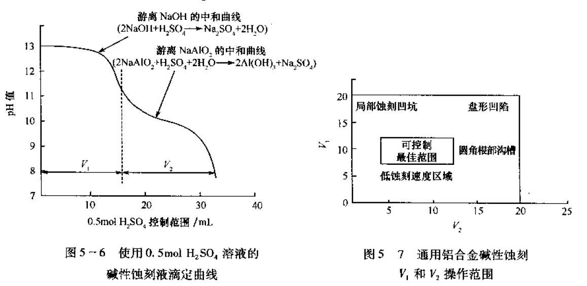 图5~6中U是中和游离NaOH所必需的0.5mol H2SO3溶液的毫升数。而V是巾和游离NaAIO2所必需的O.5molH2SO4溶液的毫升数。在图5—7中说明了对于人多数铝合金适用的两个控制因素V1和V2的操作范围。